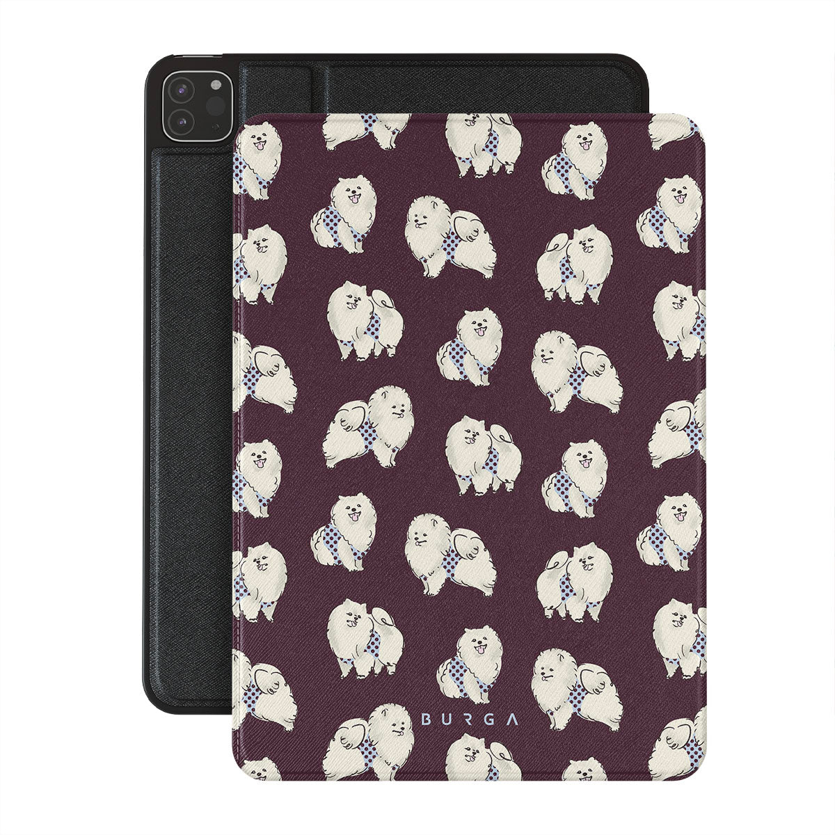 此設計特色: 深酒紅色背景搭配白色蓬鬆狗狗,貴賓犬與寵物。