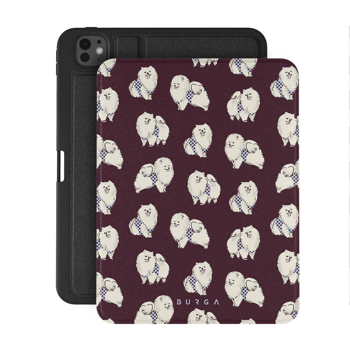 此設計特色: 深酒紅色背景搭配白色蓬鬆狗狗,貴賓犬與寵物。