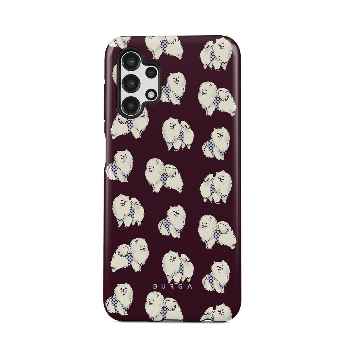 此設計特色: 深酒紅色背景搭配白色蓬鬆狗狗,貴賓犬與寵物。
