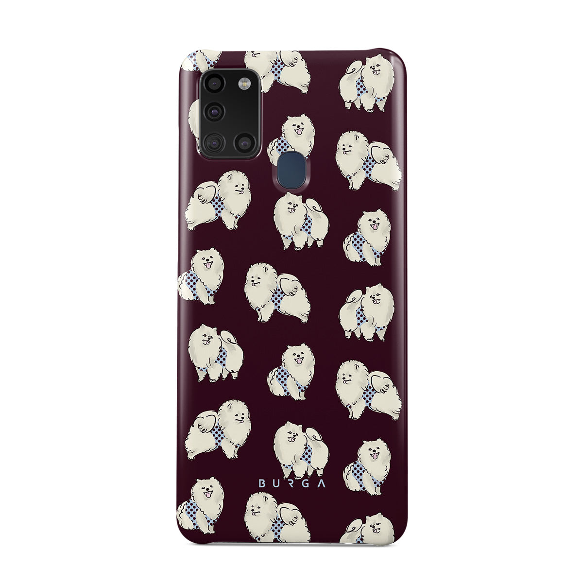此設計特色: 深酒紅色背景搭配白色蓬鬆狗狗,貴賓犬與寵物。