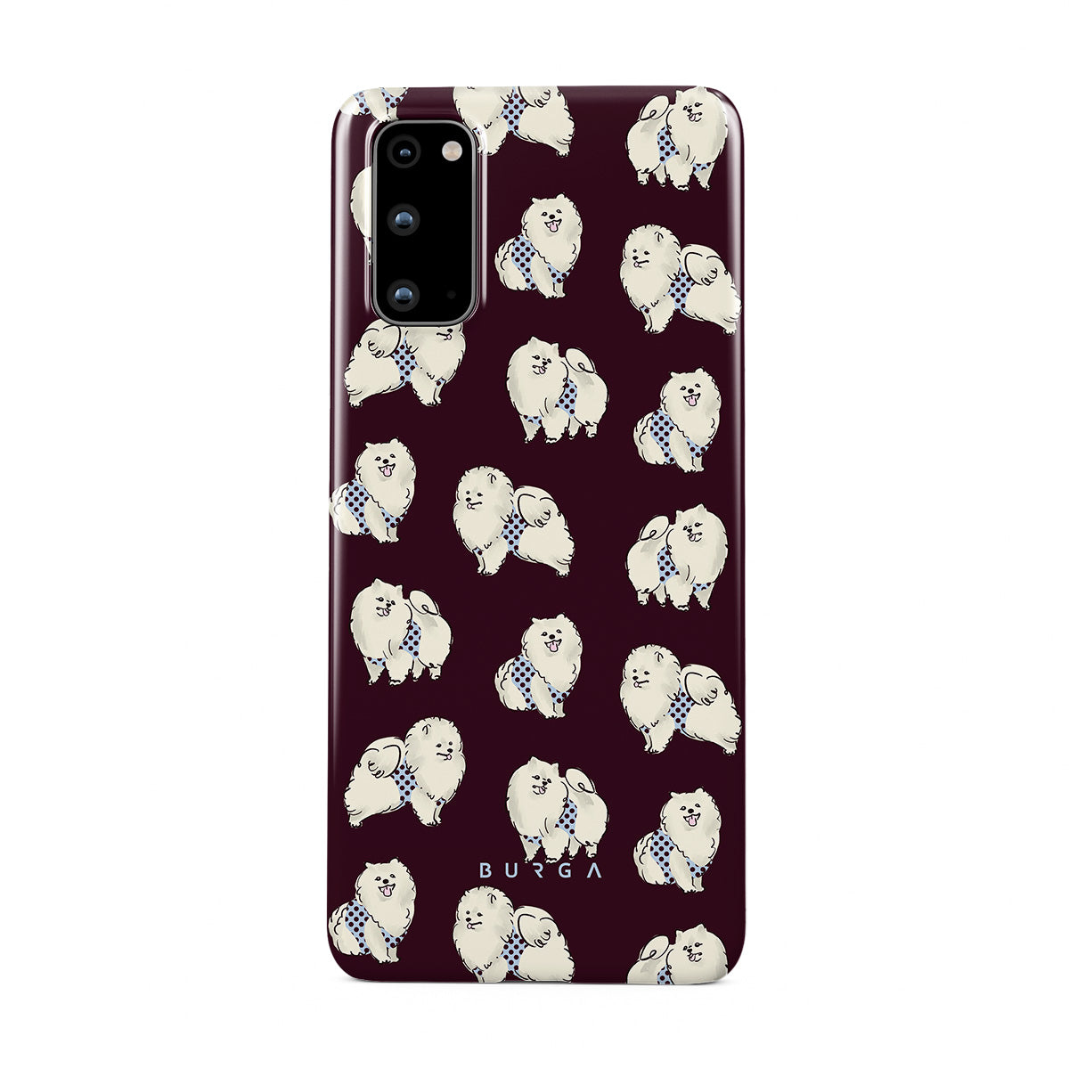 此設計特色: 深酒紅色背景搭配白色蓬鬆狗狗,貴賓犬與寵物。