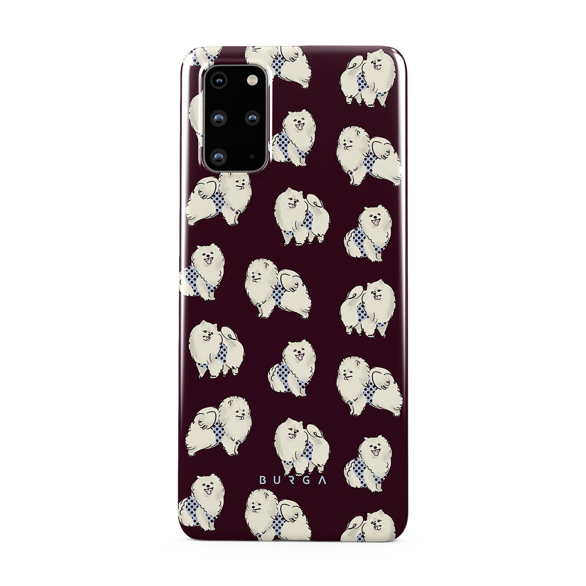 此設計特色: 深酒紅色背景搭配白色蓬鬆狗狗,貴賓犬與寵物。