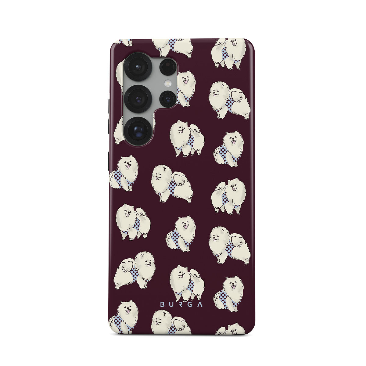 此設計特色: 深酒紅色背景搭配白色蓬鬆狗狗,貴賓犬與寵物。