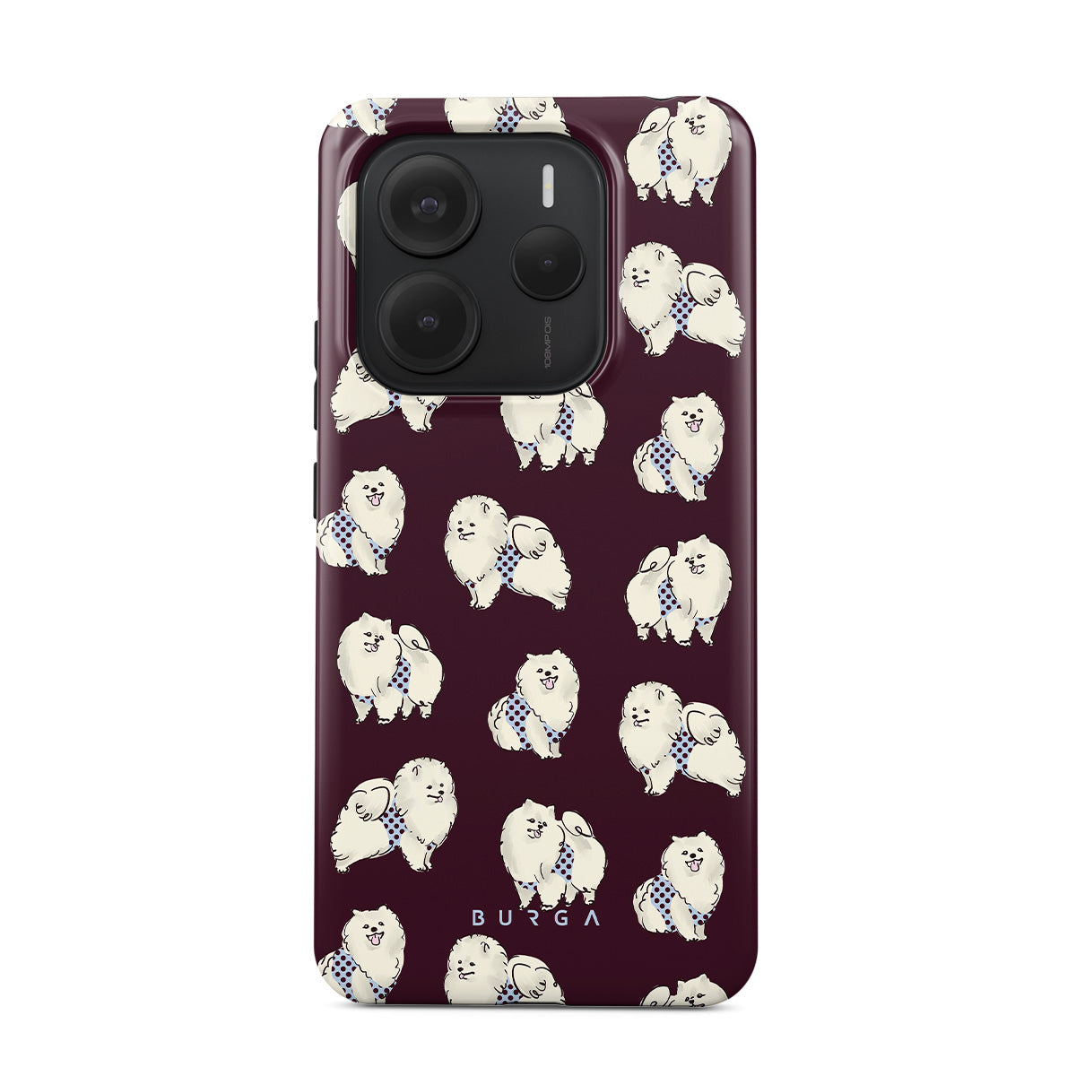 此設計特色: 深酒紅色背景搭配白色蓬鬆狗狗,貴賓犬與寵物。