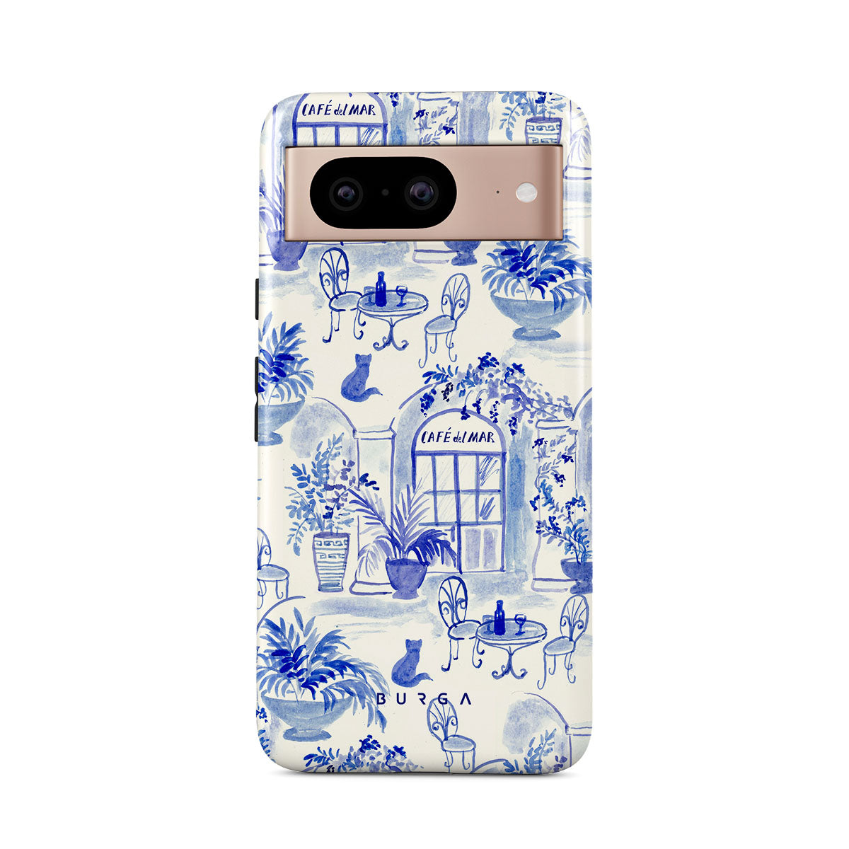 此設計特色:柔和的藍色、海岸圖案、咖啡元素、極簡風格、復古圖案、地中海圖案