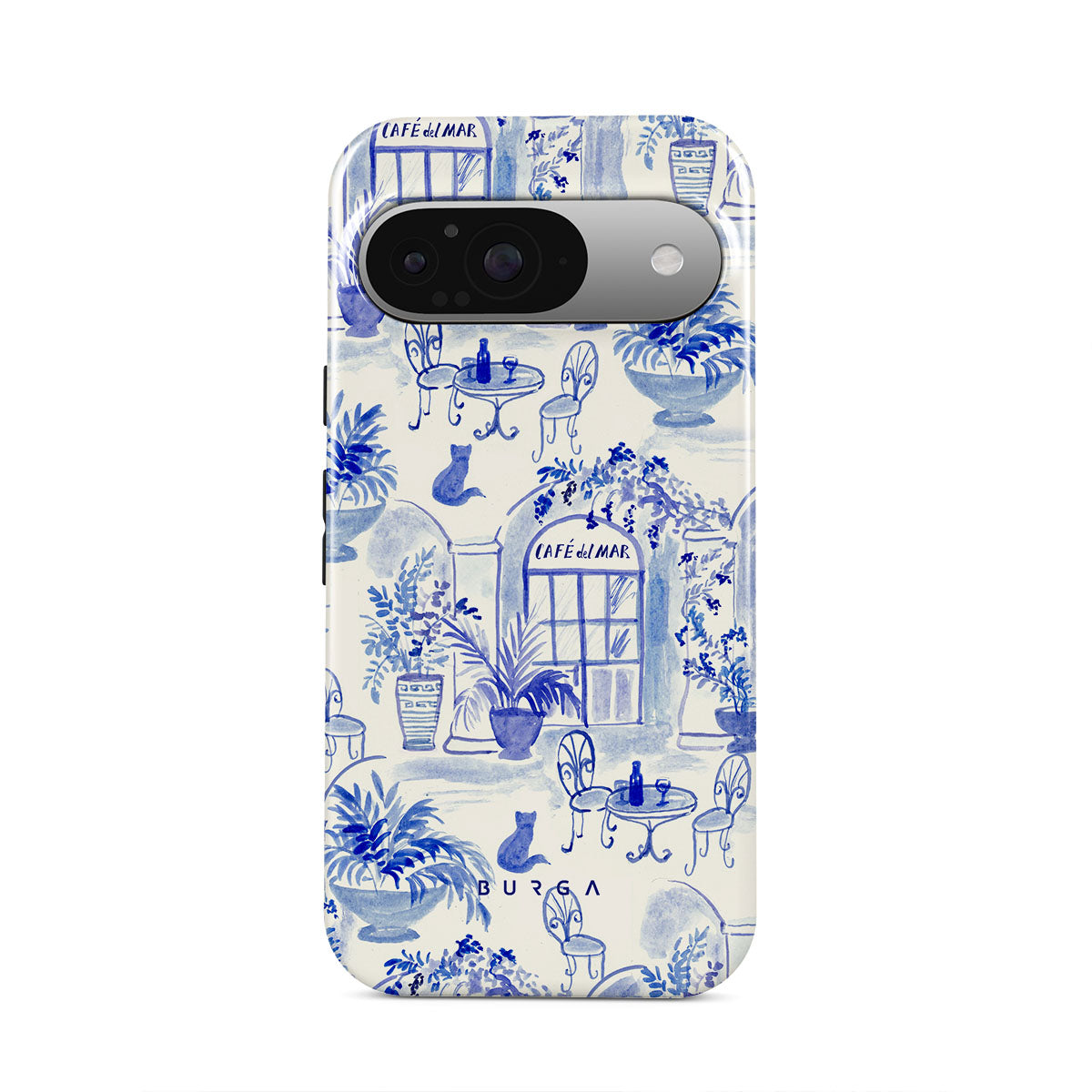 此設計特色:柔和的藍色、海岸圖案、咖啡元素、極簡風格、復古圖案、地中海圖案