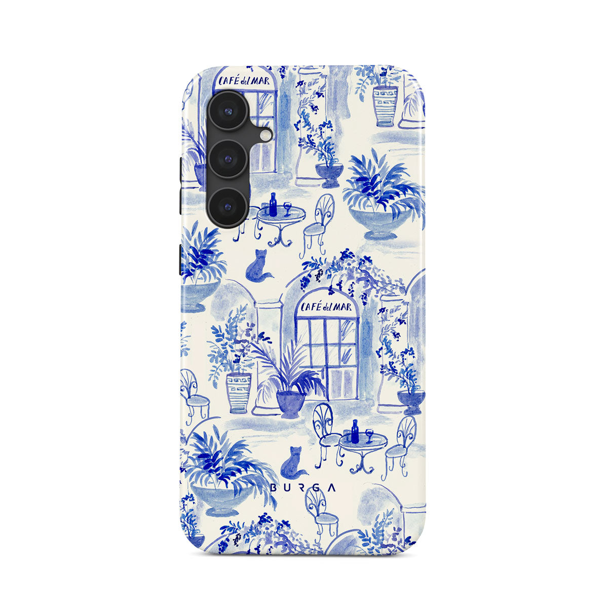 此設計特色:柔和的藍色、海岸圖案、咖啡元素、極簡風格、復古圖案、地中海圖案