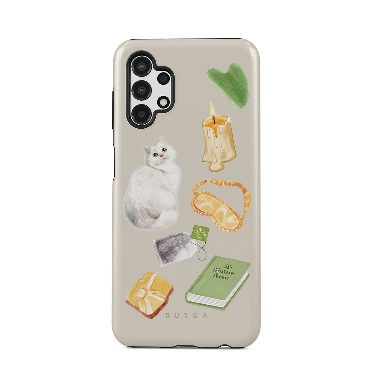 此設計特色:白貓、綠色書本、蠟燭、刮痧板、睡眠眼罩、茶包、黃色水晶