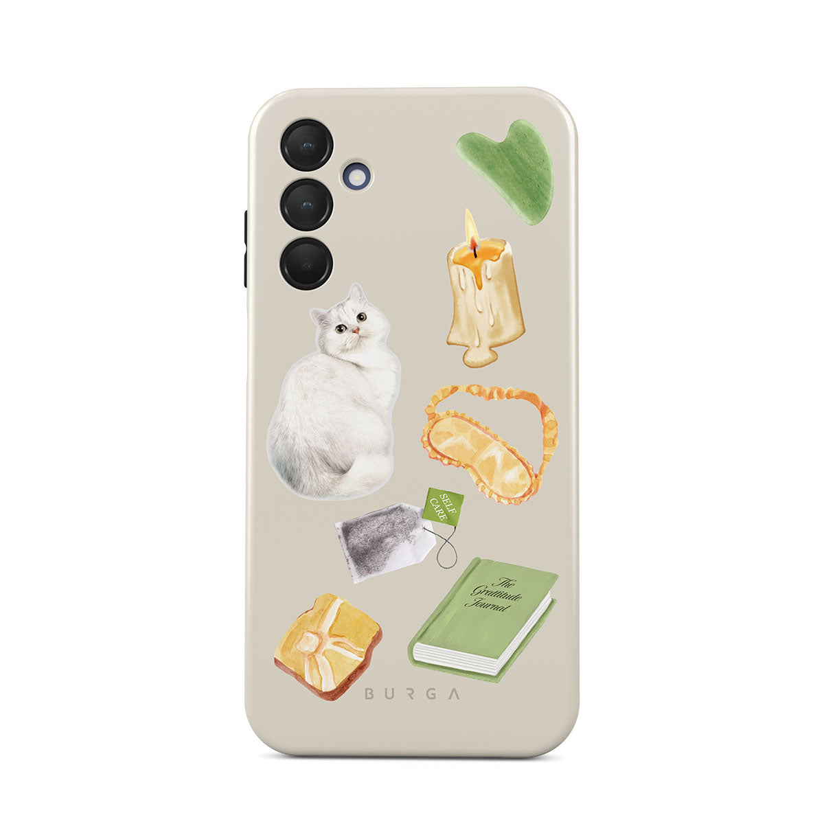 此設計特色:白貓、綠色書本、蠟燭、刮痧板、睡眠眼罩、茶包、黃色水晶