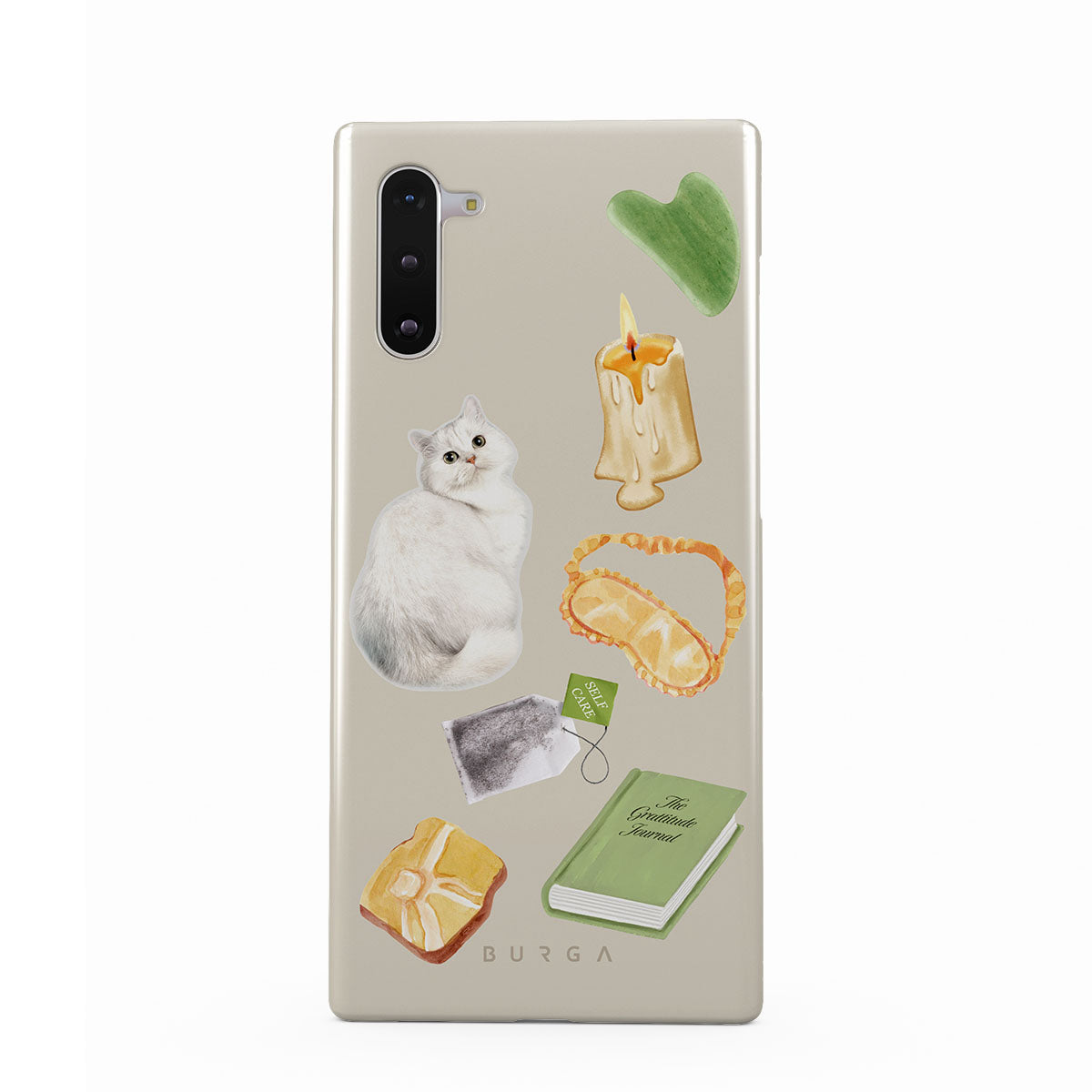 此設計特色:白貓、綠色書本、蠟燭、刮痧板、睡眠眼罩、茶包、黃色水晶