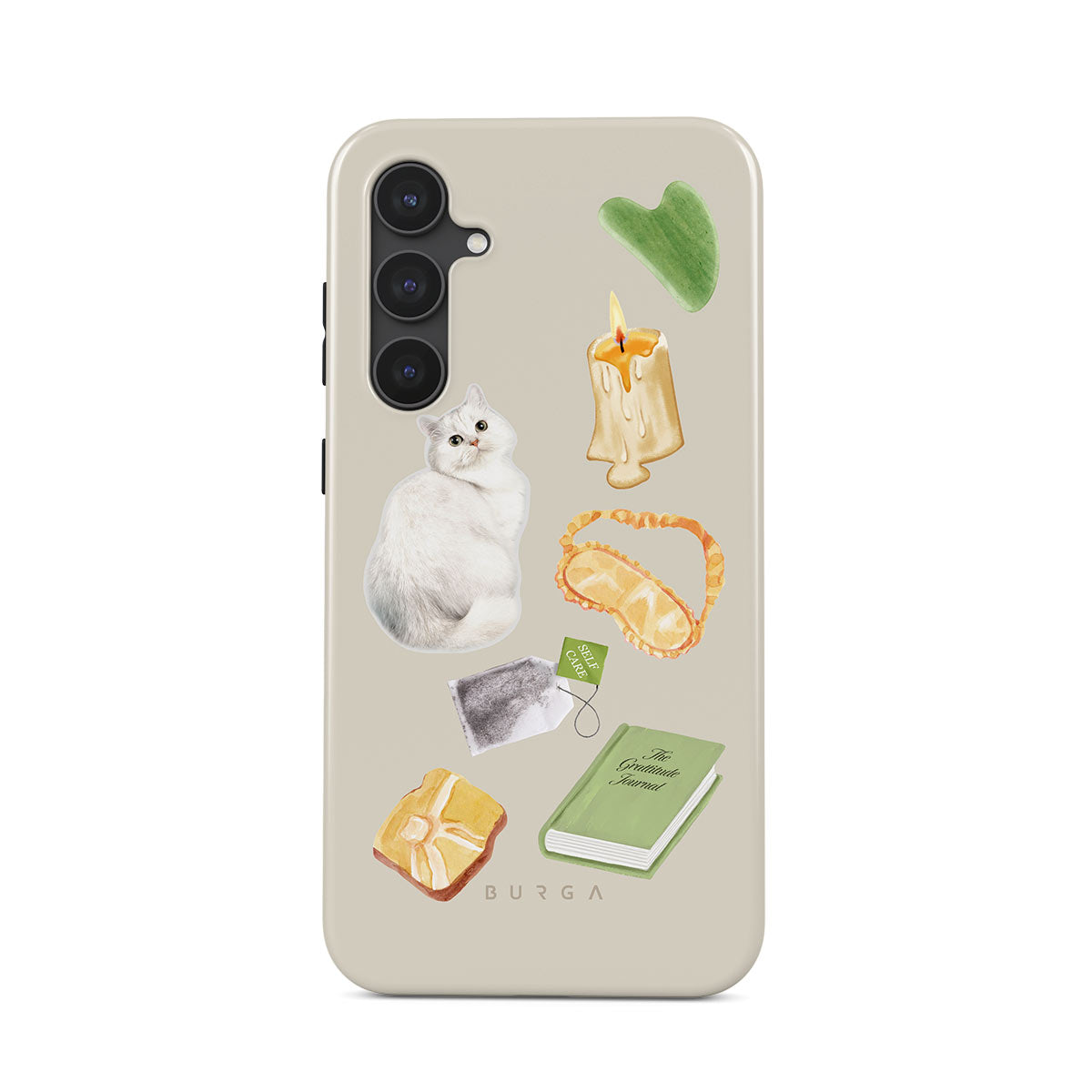 此設計特色:白貓、綠色書本、蠟燭、刮痧板、睡眠眼罩、茶包、黃色水晶