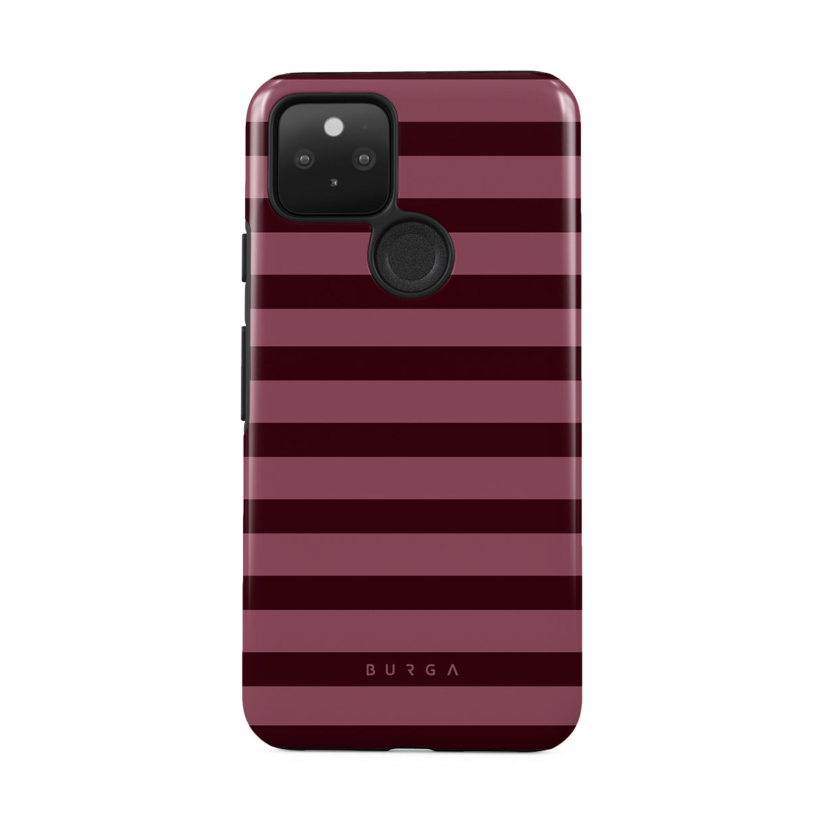 此設計特色:復古的酒紅色和粉紅色橫條紋