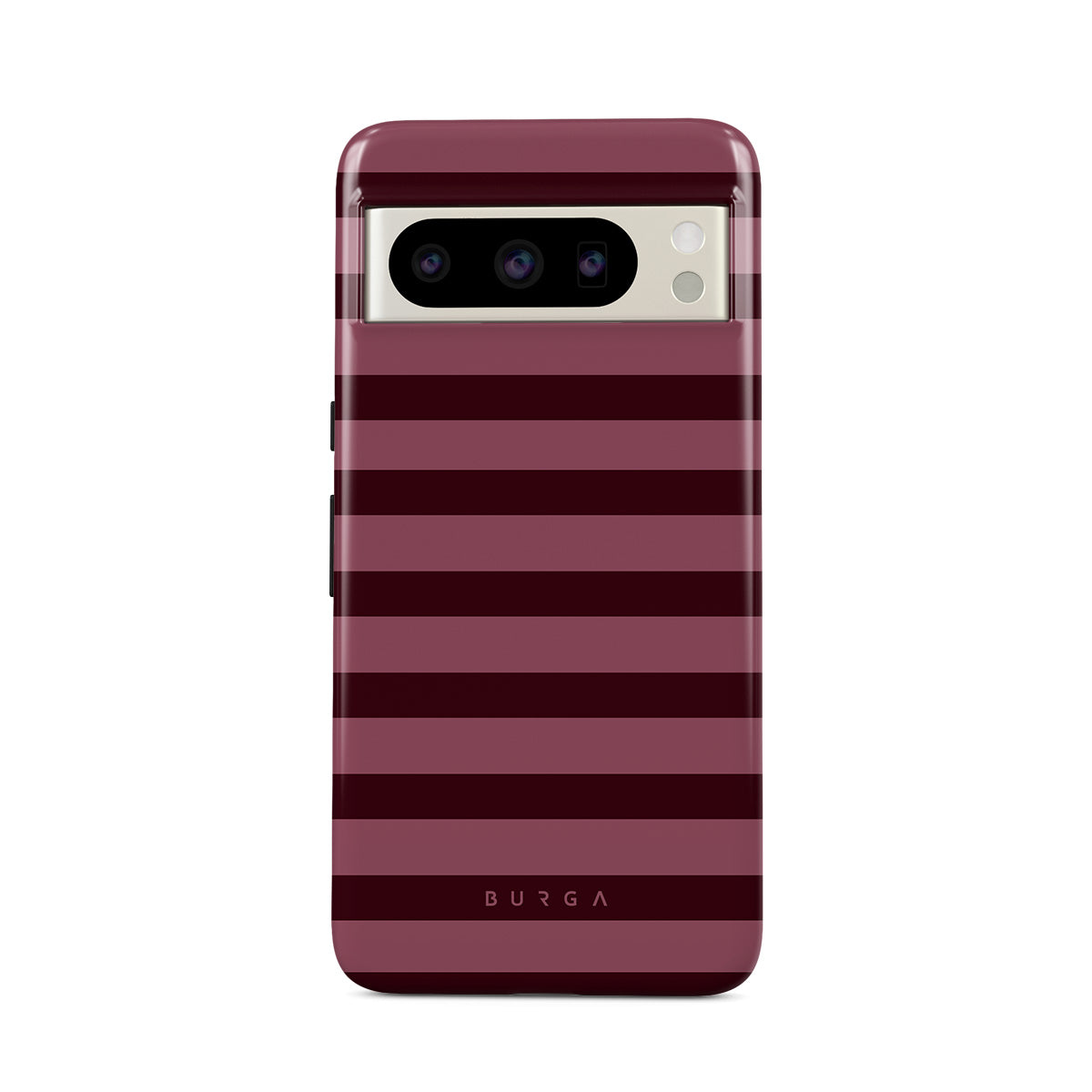此設計特色:復古的酒紅色和粉紅色橫條紋