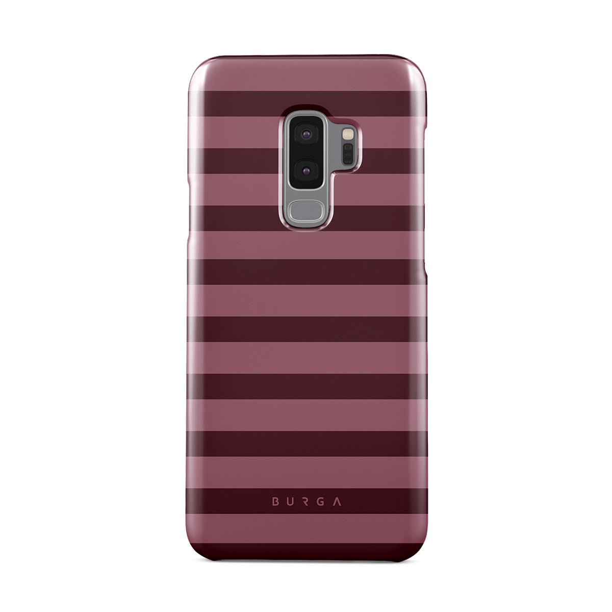 此設計特色:復古的酒紅色和粉紅色橫條紋