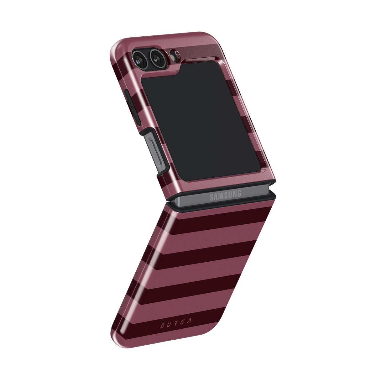 此設計特色:復古的酒紅色和粉紅色橫條紋