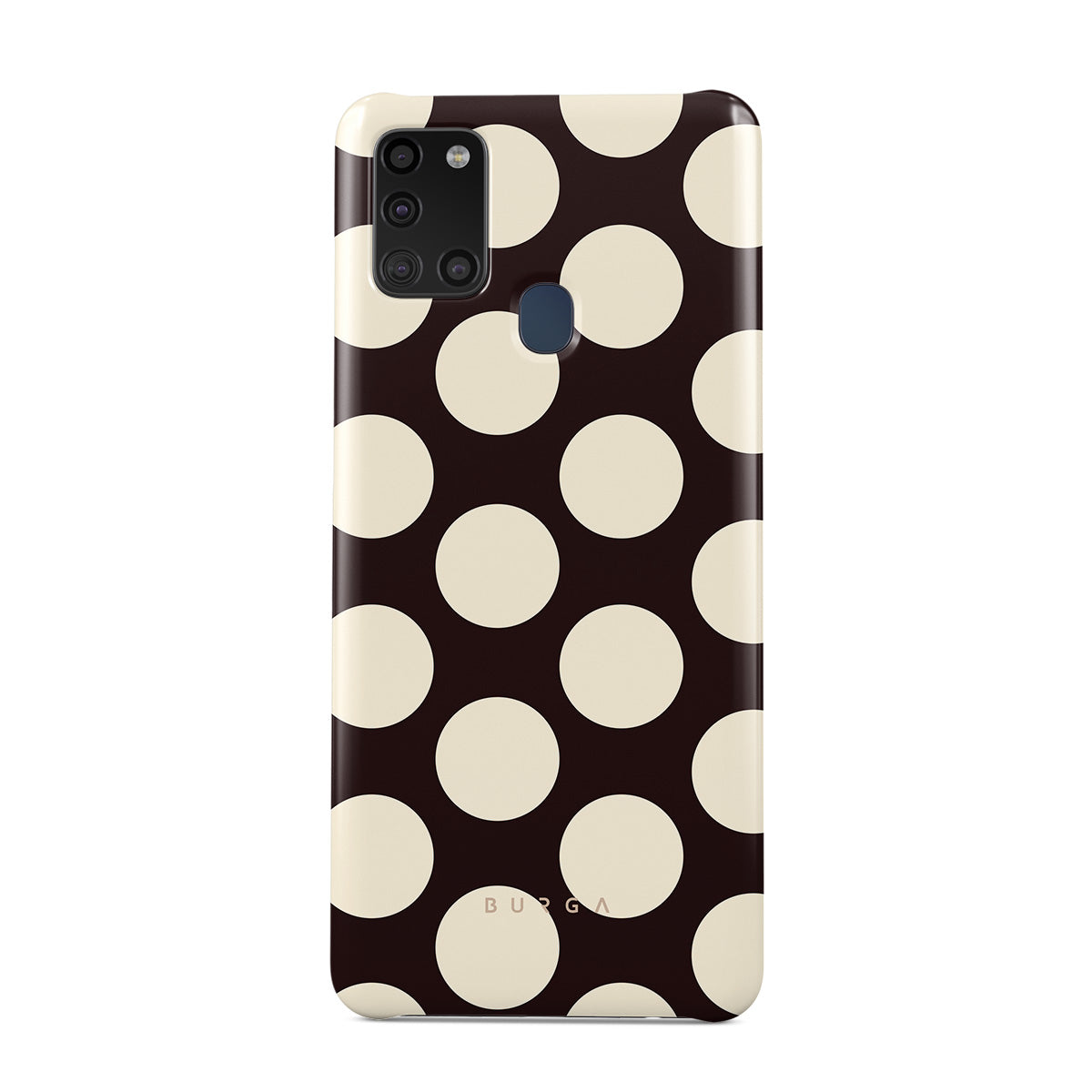 此設計特色: 深色背景搭配大奶油色圓點。