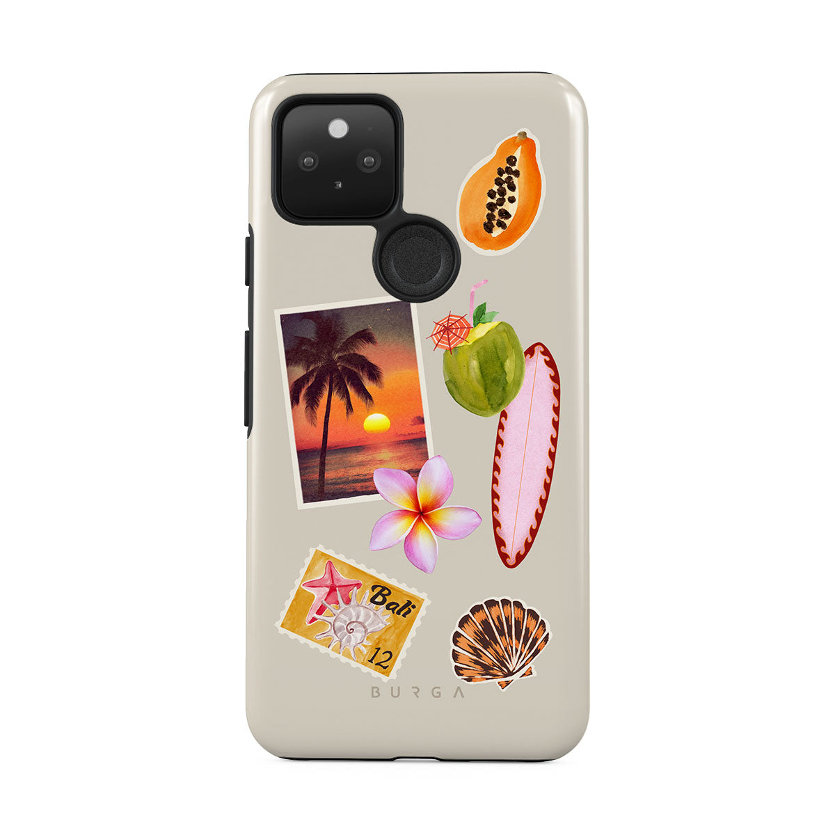 此設計特色:熱帶日落照片、木瓜、綠色椰子、粉色衝浪板、粉色雞蛋花、橙色貝殼、峇里島明信片