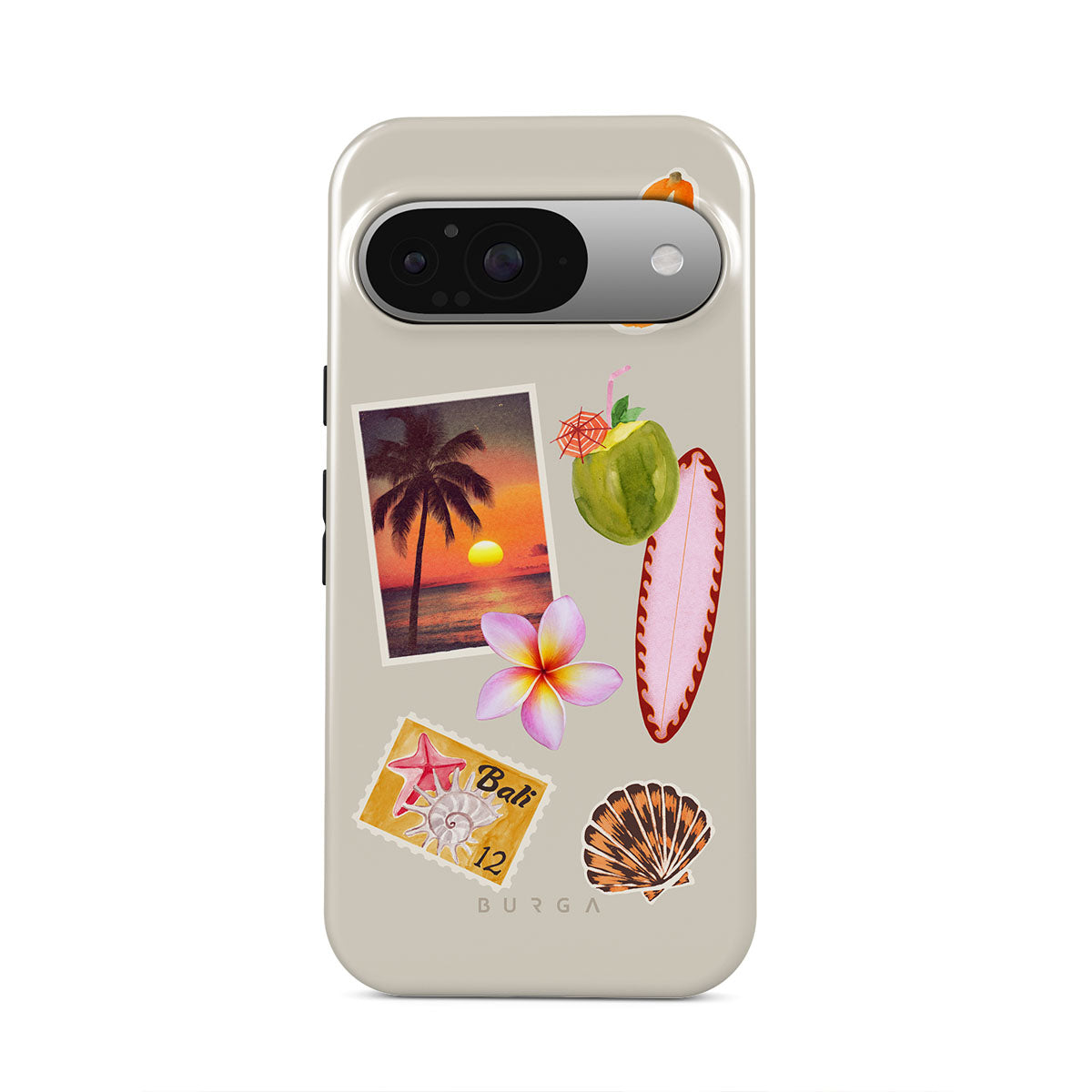 此設計特色:熱帶日落照片、木瓜、綠色椰子、粉色衝浪板、粉色雞蛋花、橙色貝殼、峇里島明信片