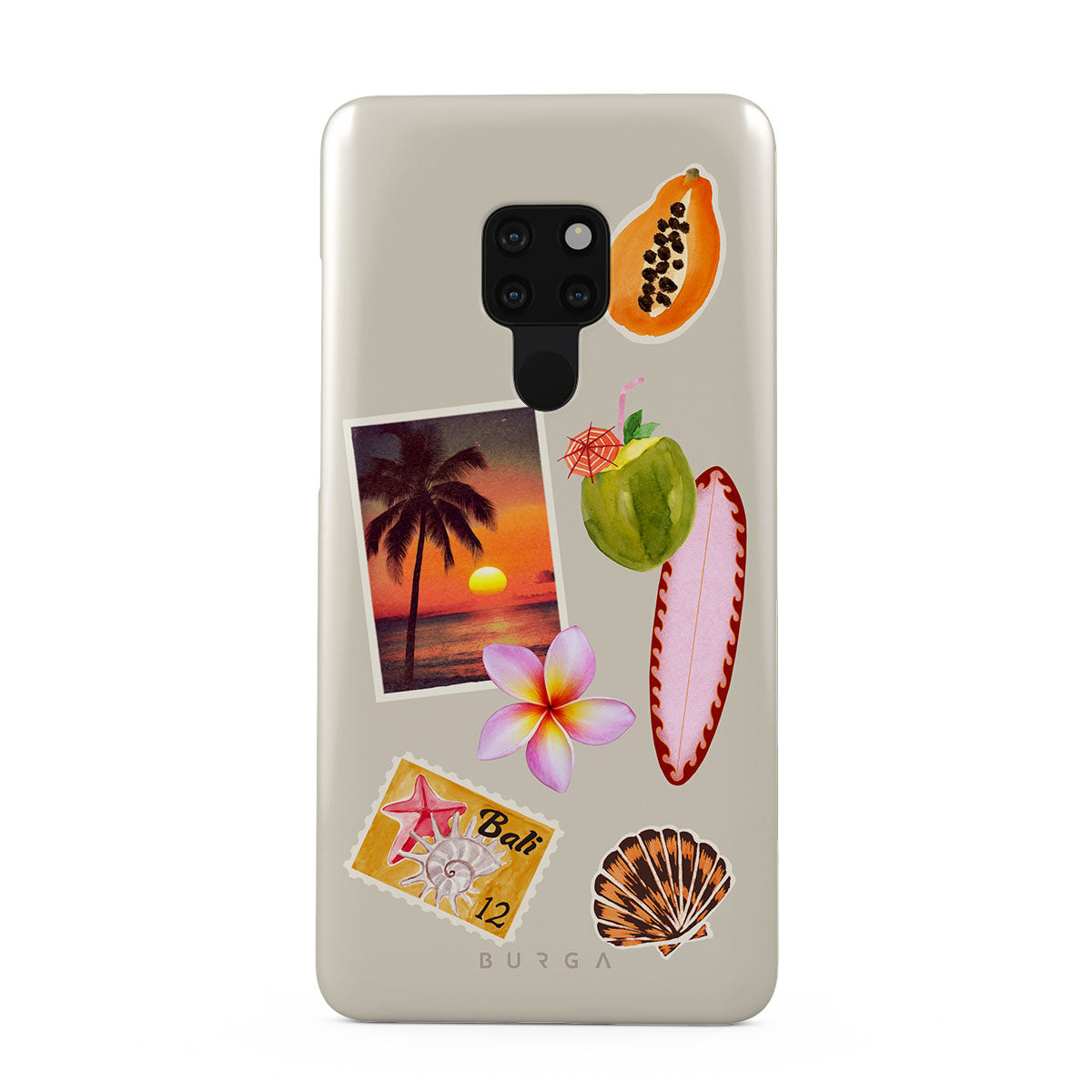 此設計特色:熱帶日落照片、木瓜、綠色椰子、粉色衝浪板、粉色雞蛋花、橙色貝殼、峇里島明信片