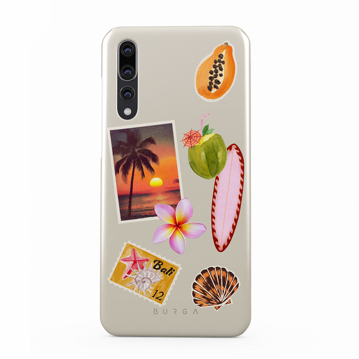此設計特色:熱帶日落照片、木瓜、綠色椰子、粉色衝浪板、粉色雞蛋花、橙色貝殼、峇里島明信片