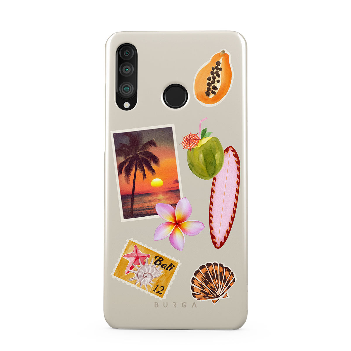 此設計特色:熱帶日落照片、木瓜、綠色椰子、粉色衝浪板、粉色雞蛋花、橙色貝殼、峇里島明信片
