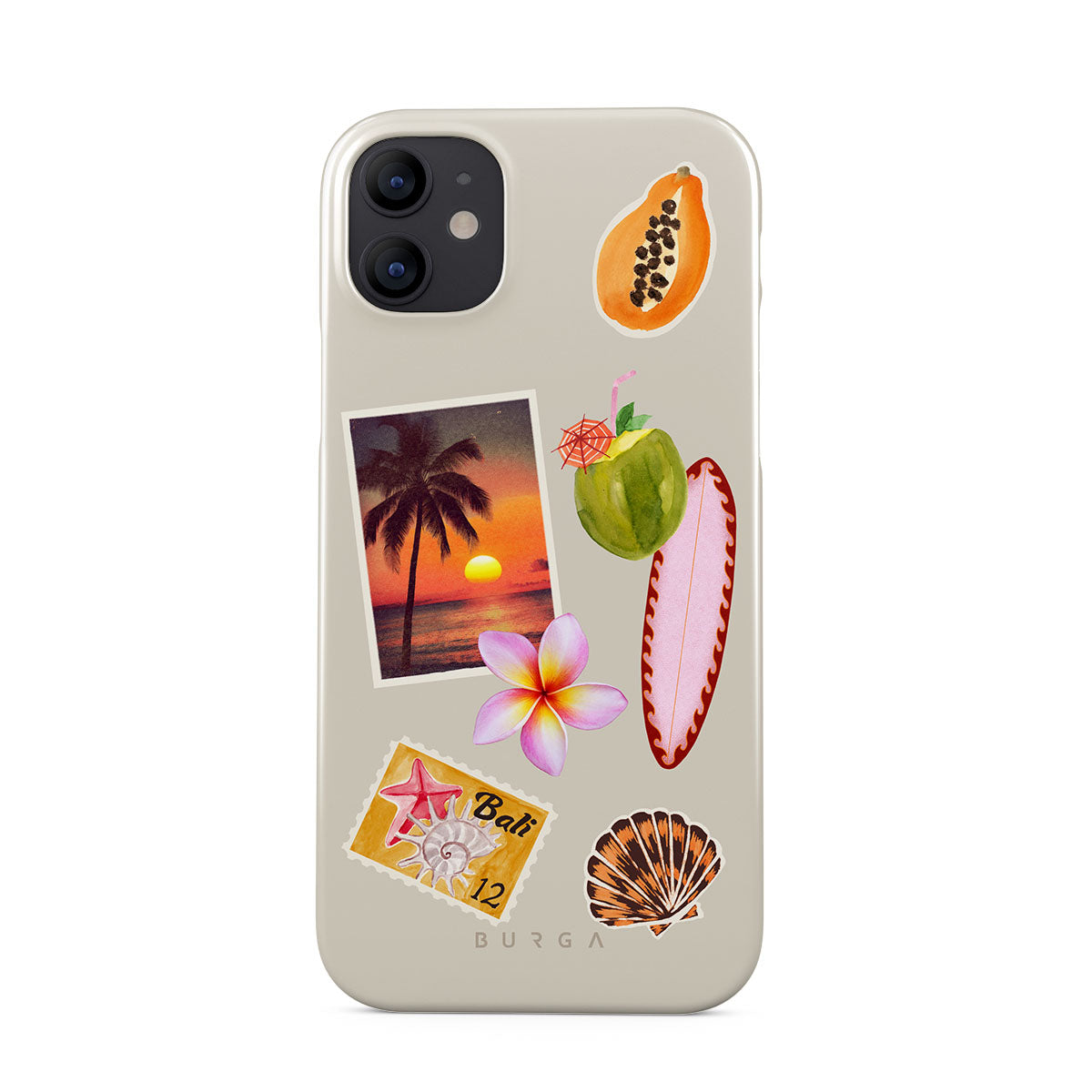 此設計特色:熱帶日落照片、木瓜、綠色椰子、粉色衝浪板、粉色雞蛋花、橙色貝殼、峇里島明信片