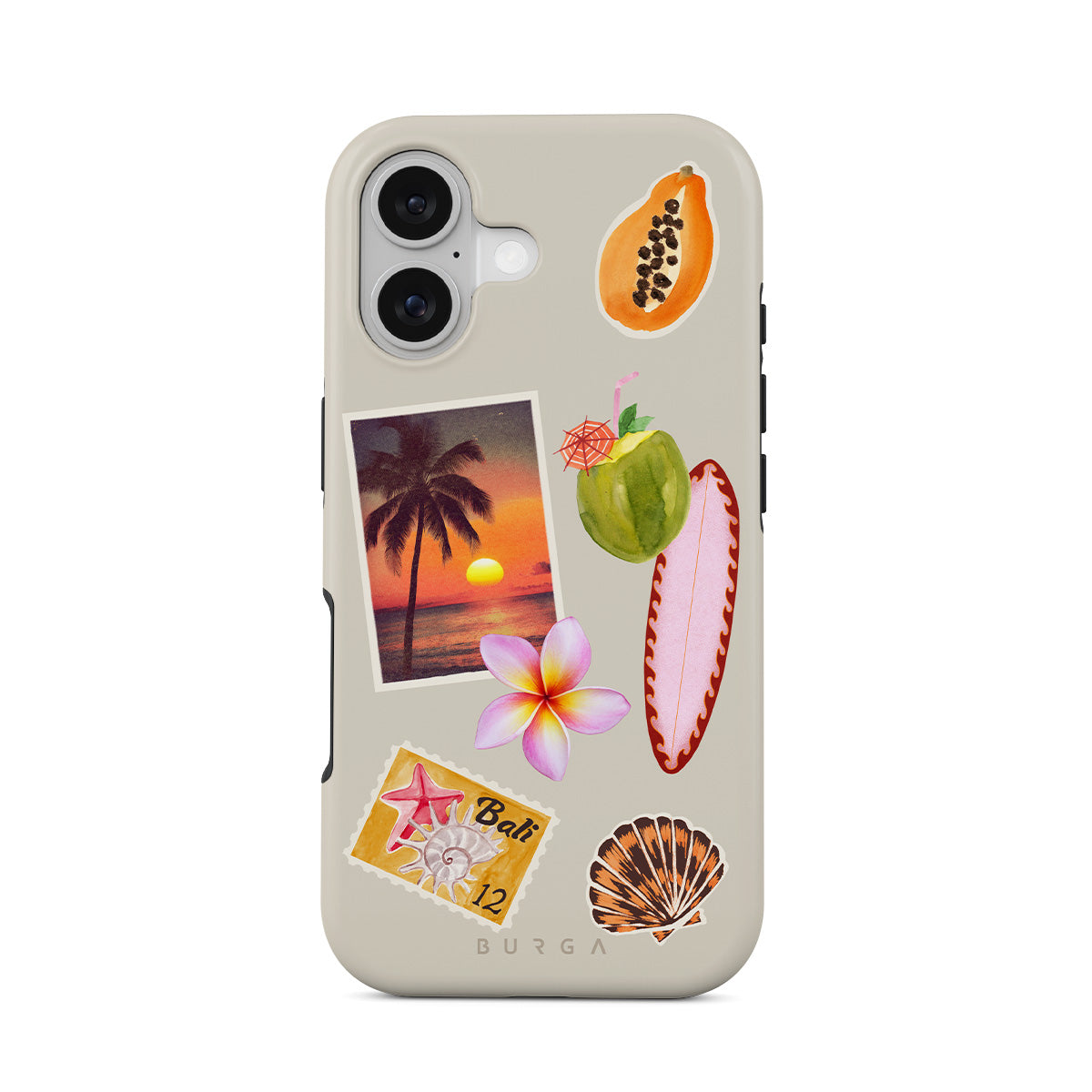 此設計特色:熱帶日落照片、木瓜、綠色椰子、粉色衝浪板、粉色雞蛋花、橙色貝殼、峇里島明信片