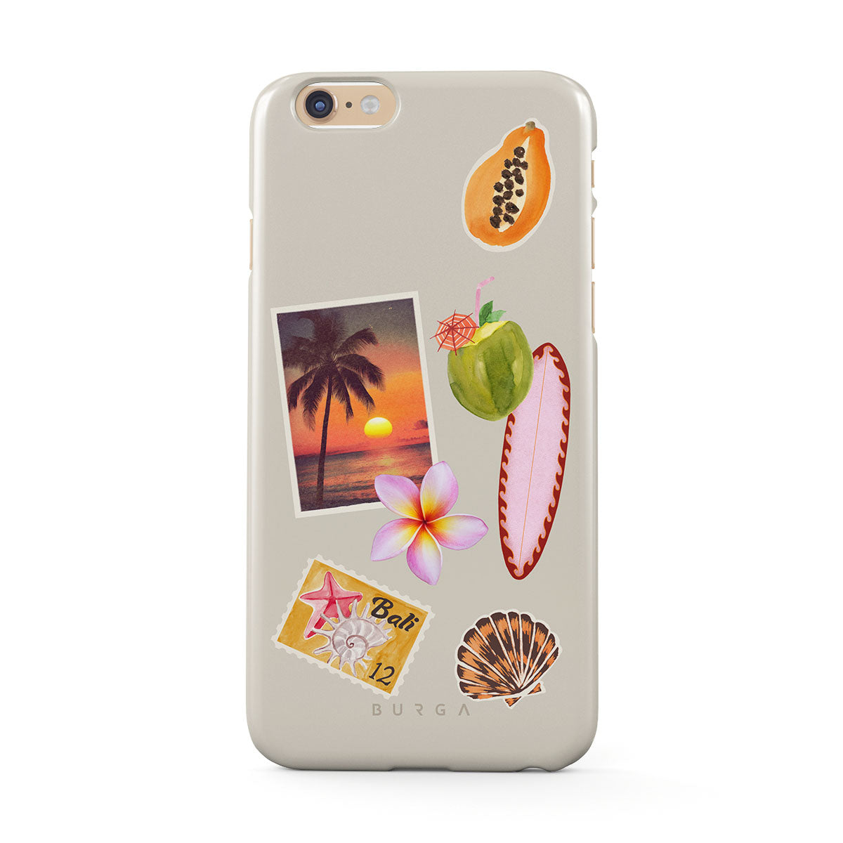 此設計特色:熱帶日落照片、木瓜、綠色椰子、粉色衝浪板、粉色雞蛋花、橙色貝殼、峇里島明信片