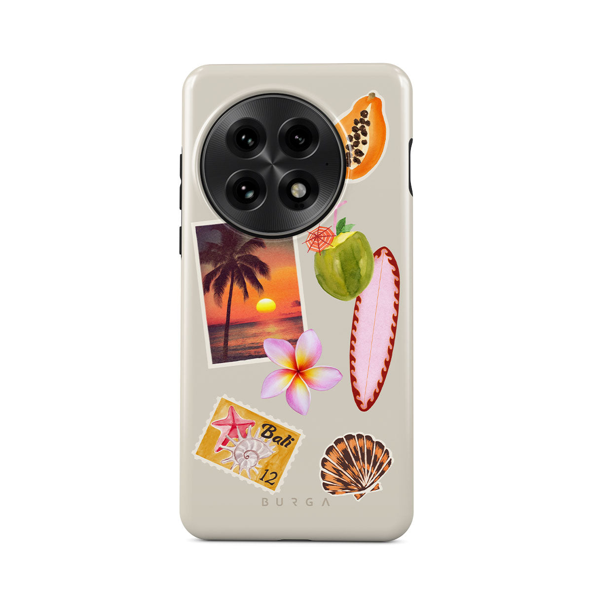 此設計特色:熱帶日落照片、木瓜、綠色椰子、粉色衝浪板、粉色雞蛋花、橙色貝殼、峇里島明信片