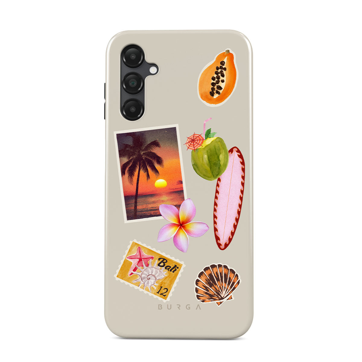 此設計特色:熱帶日落照片、木瓜、綠色椰子、粉色衝浪板、粉色雞蛋花、橙色貝殼、峇里島明信片