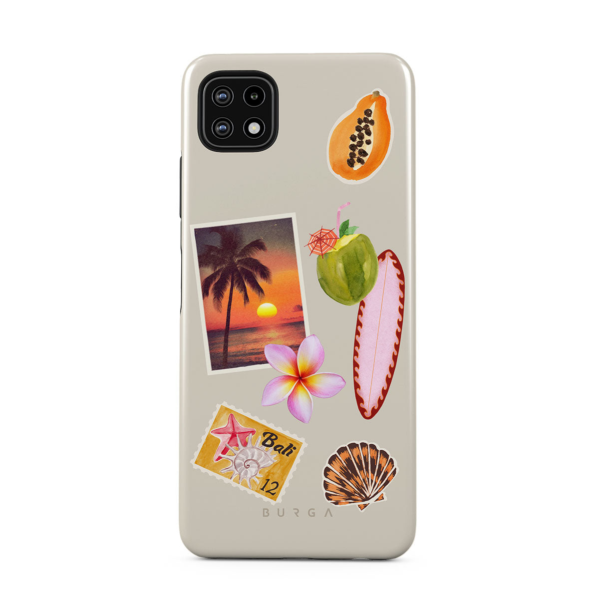 此設計特色:熱帶日落照片、木瓜、綠色椰子、粉色衝浪板、粉色雞蛋花、橙色貝殼、峇里島明信片