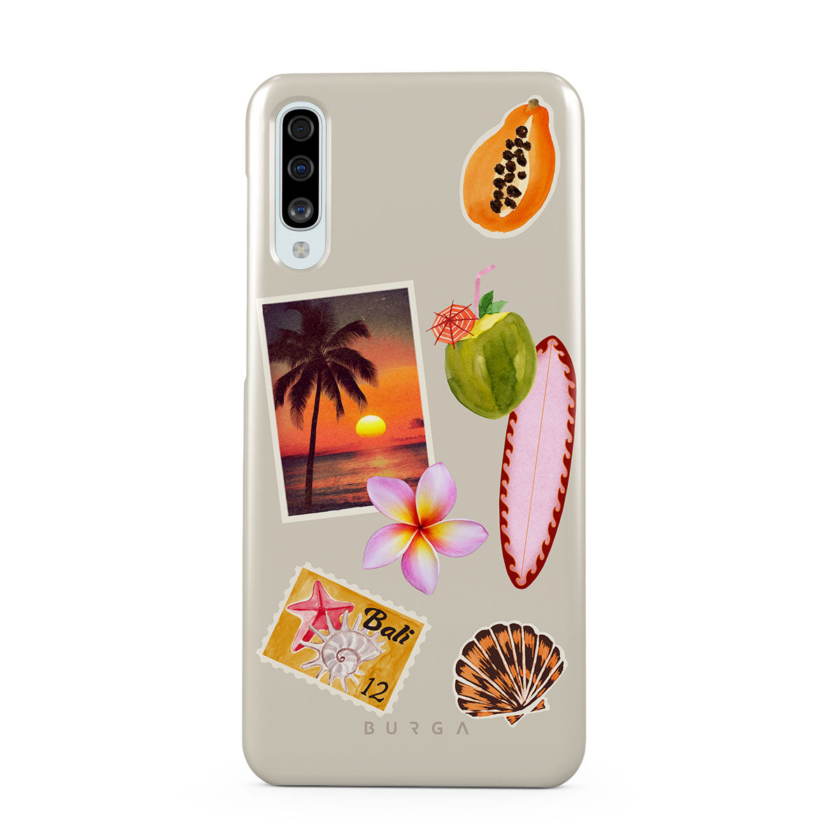 此設計特色:熱帶日落照片、木瓜、綠色椰子、粉色衝浪板、粉色雞蛋花、橙色貝殼、峇里島明信片