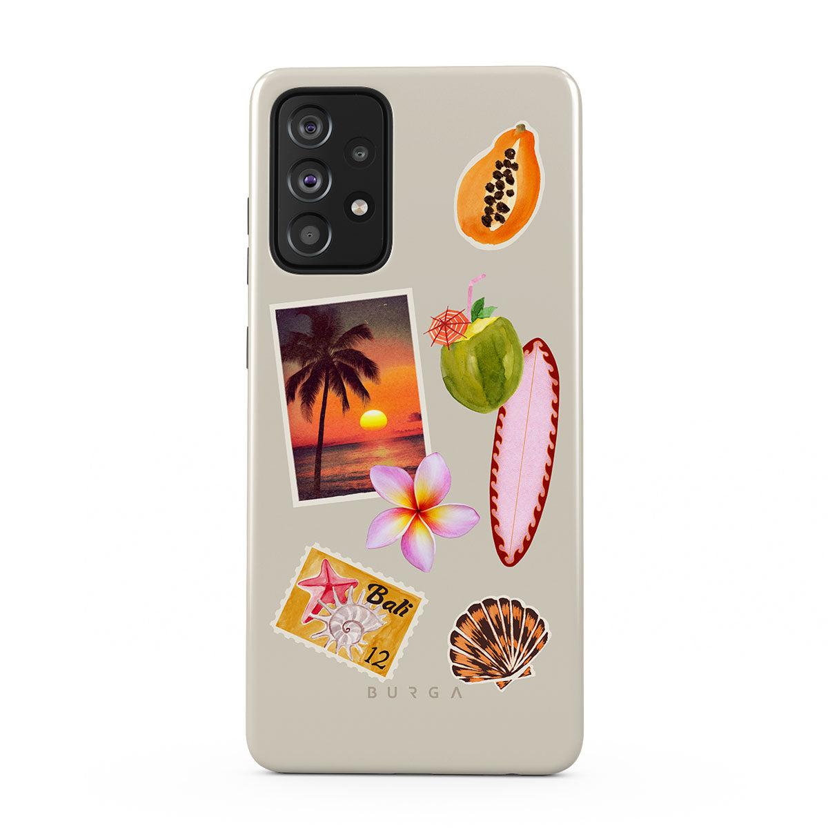此設計特色:熱帶日落照片、木瓜、綠色椰子、粉色衝浪板、粉色雞蛋花、橙色貝殼、峇里島明信片