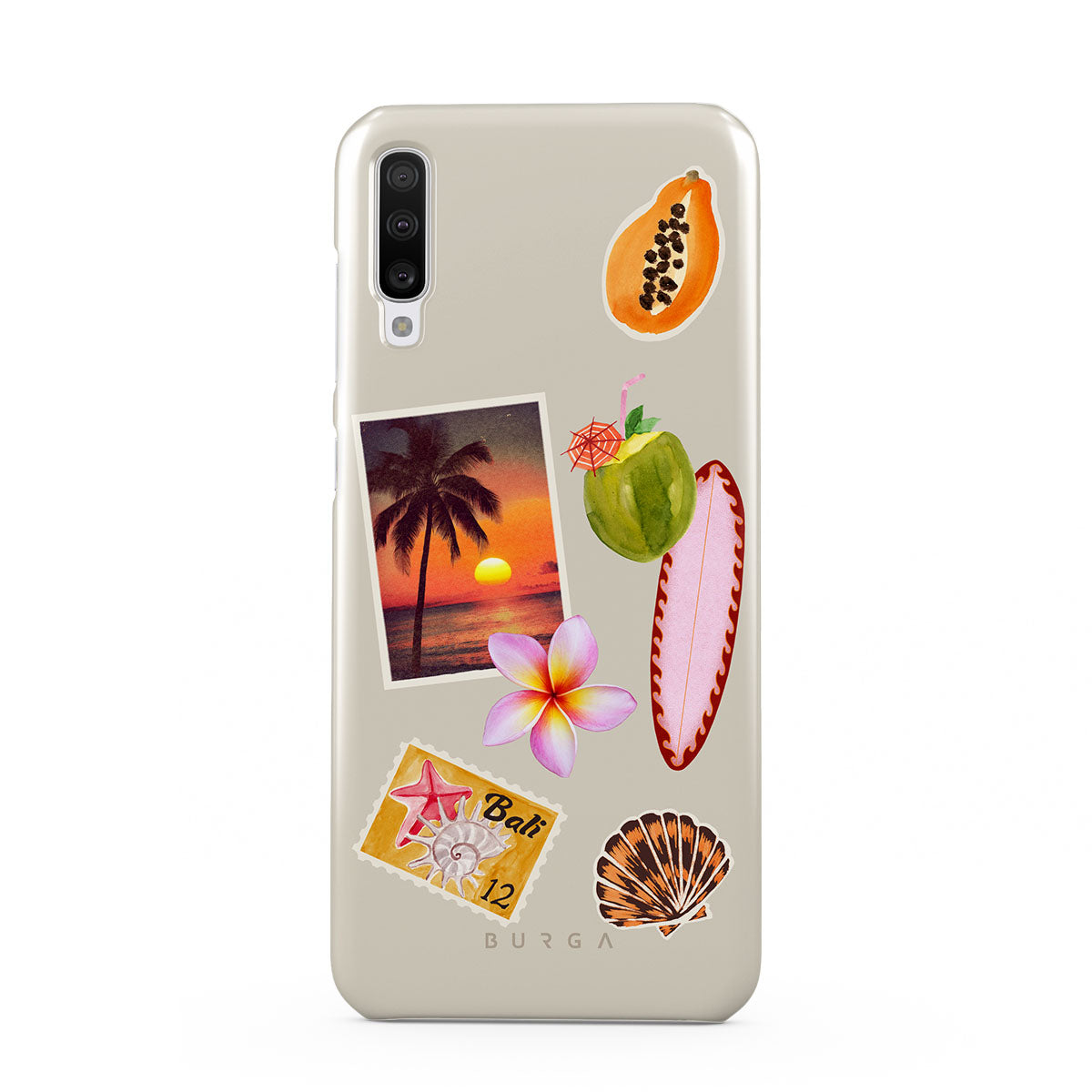 此設計特色:熱帶日落照片、木瓜、綠色椰子、粉色衝浪板、粉色雞蛋花、橙色貝殼、峇里島明信片