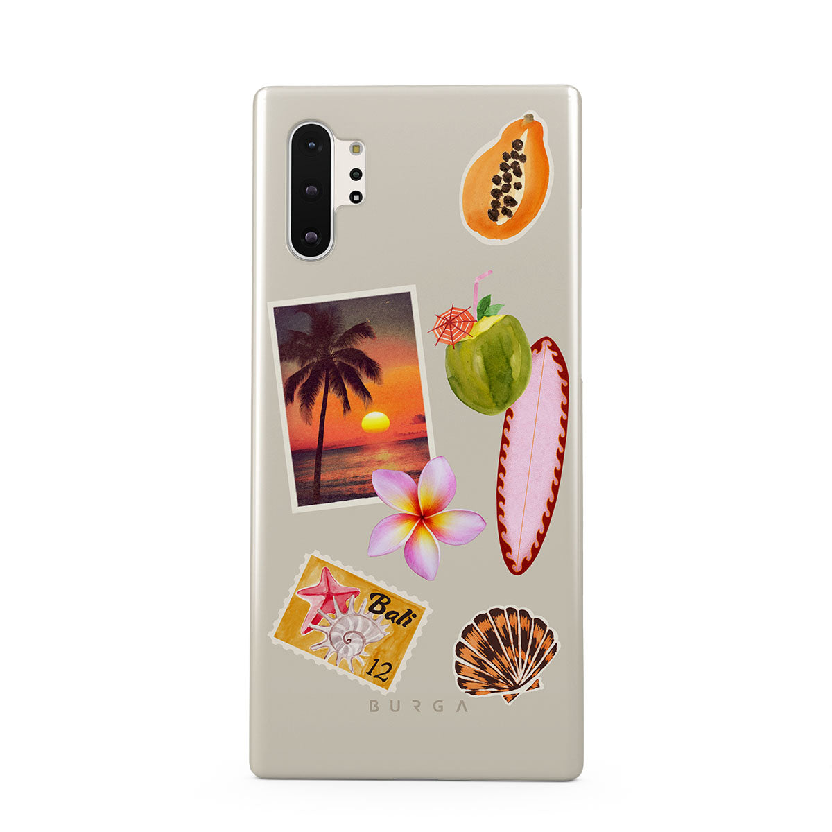 此設計特色:熱帶日落照片、木瓜、綠色椰子、粉色衝浪板、粉色雞蛋花、橙色貝殼、峇里島明信片