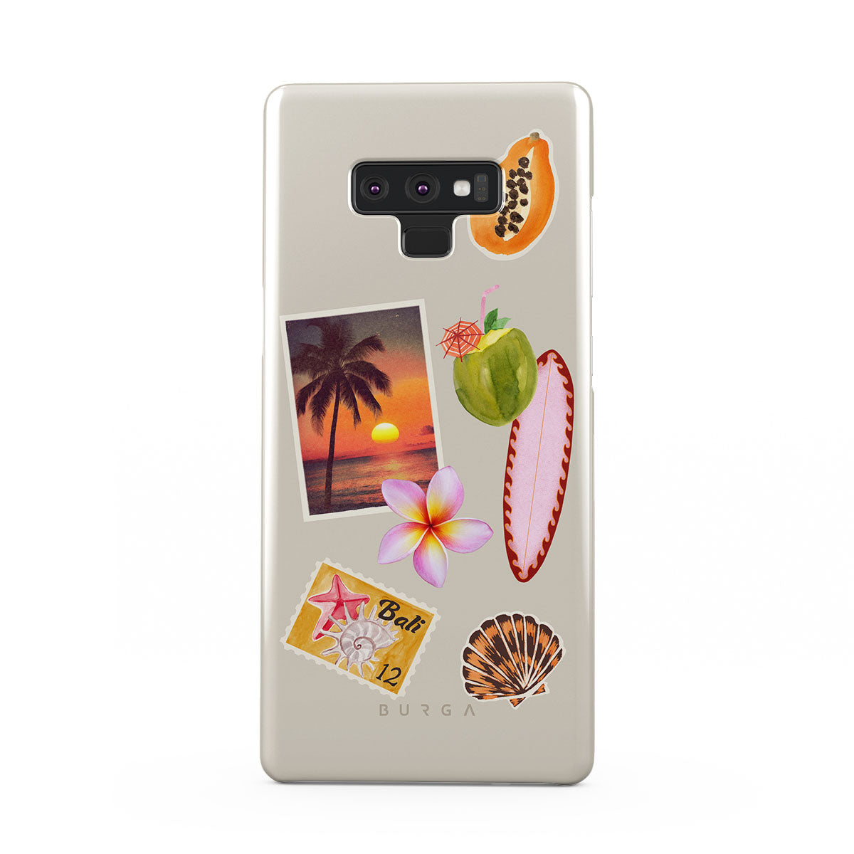 此設計特色:熱帶日落照片、木瓜、綠色椰子、粉色衝浪板、粉色雞蛋花、橙色貝殼、峇里島明信片