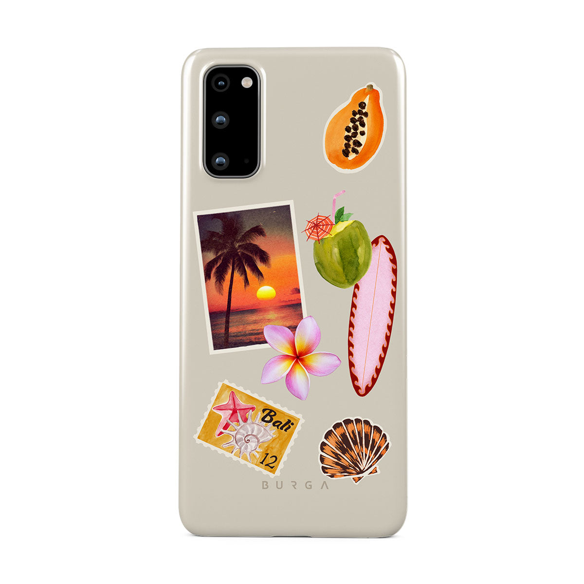 此設計特色:熱帶日落照片、木瓜、綠色椰子、粉色衝浪板、粉色雞蛋花、橙色貝殼、峇里島明信片