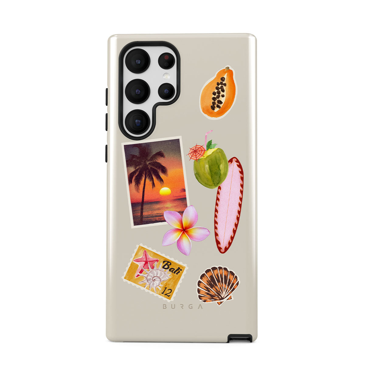 此設計特色:熱帶日落照片、木瓜、綠色椰子、粉色衝浪板、粉色雞蛋花、橙色貝殼、峇里島明信片