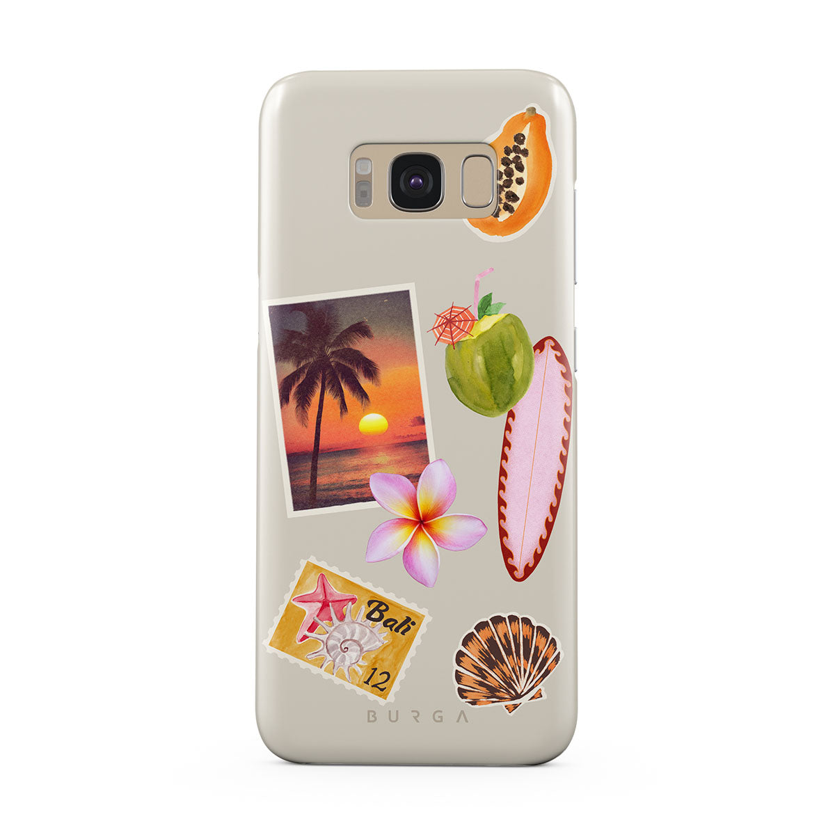 此設計特色:熱帶日落照片、木瓜、綠色椰子、粉色衝浪板、粉色雞蛋花、橙色貝殼、峇里島明信片