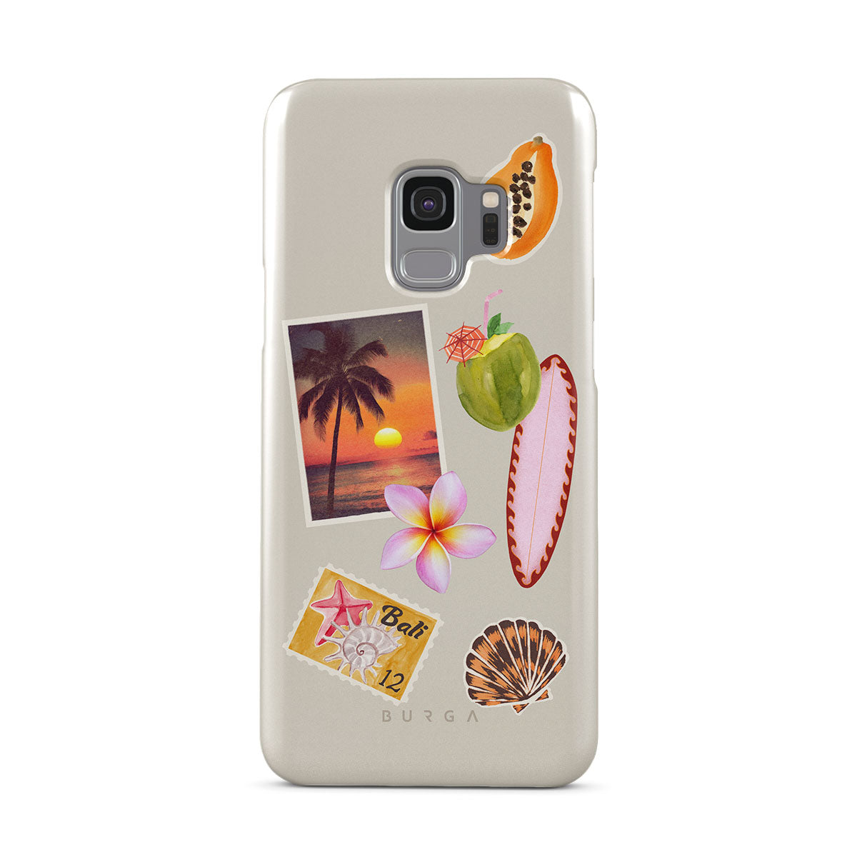 此設計特色:熱帶日落照片、木瓜、綠色椰子、粉色衝浪板、粉色雞蛋花、橙色貝殼、峇里島明信片