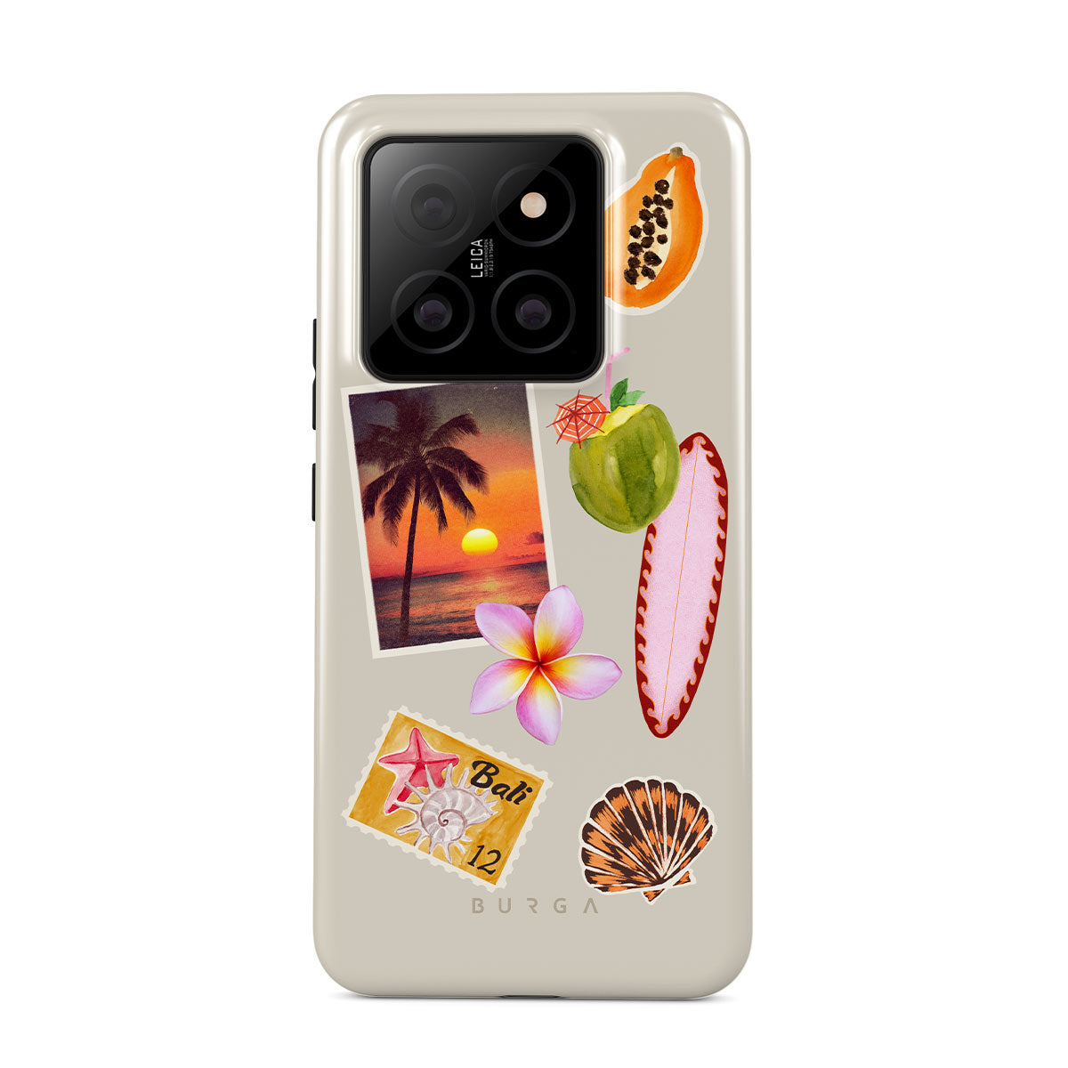 此設計特色:熱帶日落照片、木瓜、綠色椰子、粉色衝浪板、粉色雞蛋花、橙色貝殼、峇里島明信片