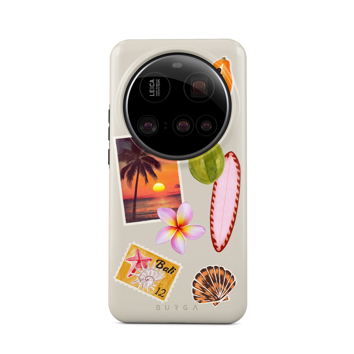 此設計特色:熱帶日落照片、木瓜、綠色椰子、粉色衝浪板、粉色雞蛋花、橙色貝殼、峇里島明信片