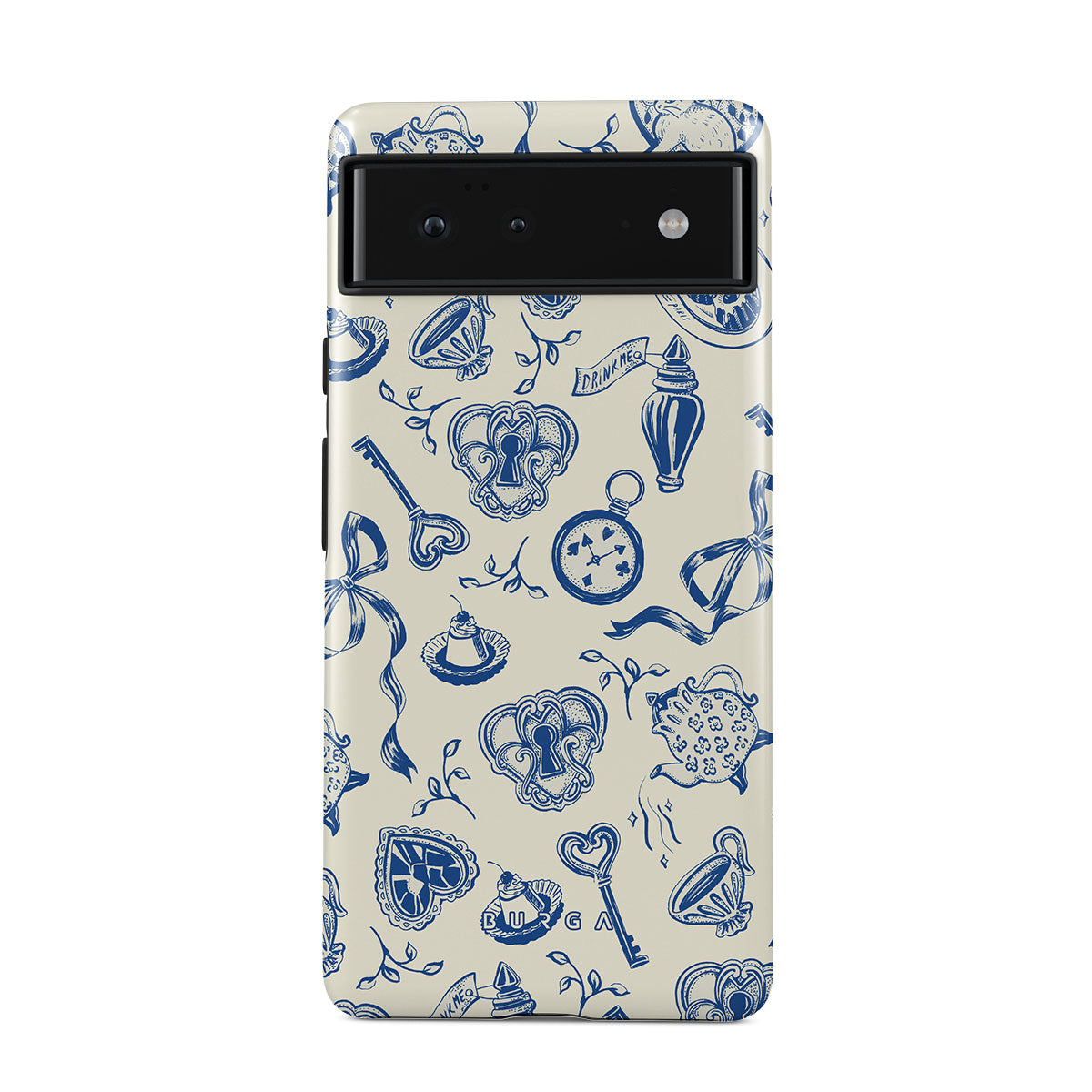 此設計特色: 茶杯、茶壺、懷錶、鑰匙、紅心、陶瓷、藍白圖案