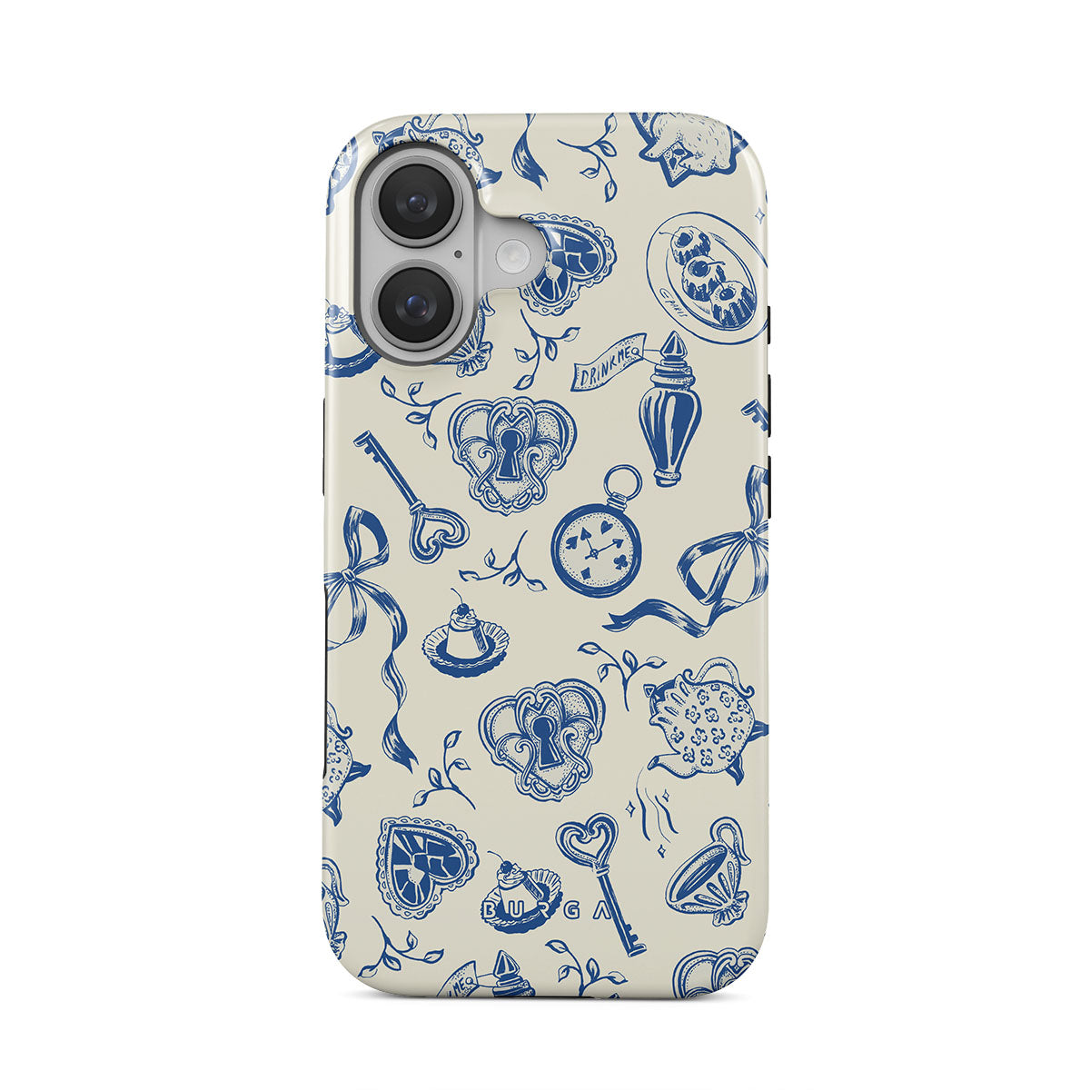 此設計特色: 茶杯、茶壺、懷錶、鑰匙、紅心、陶瓷、藍白圖案