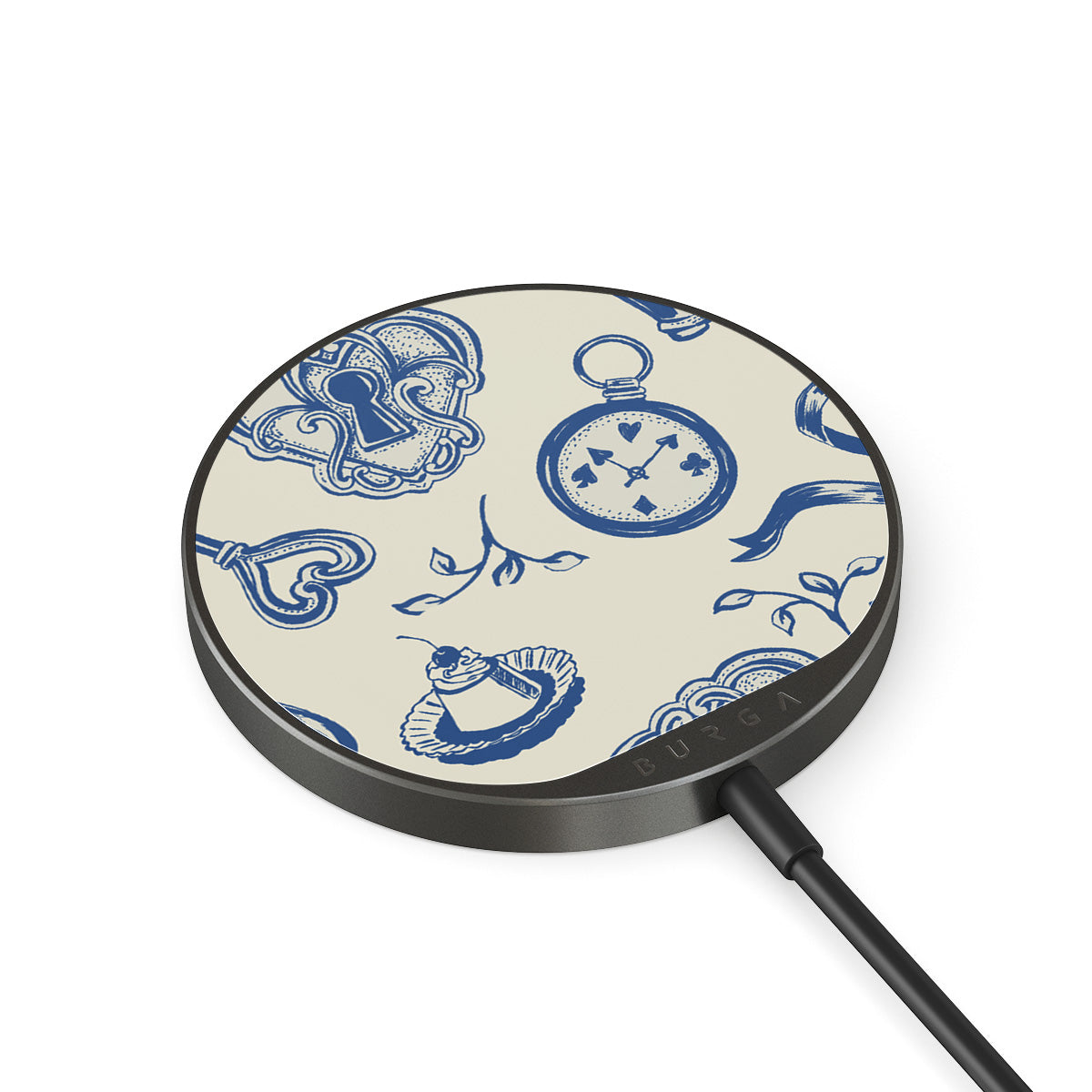 此設計特色: 茶杯、茶壺、懷錶、鑰匙、紅心、陶瓷、藍白圖案