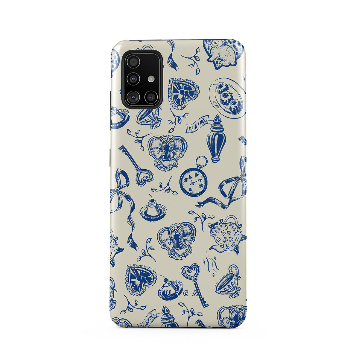 此設計特色: 茶杯、茶壺、懷錶、鑰匙、紅心、陶瓷、藍白圖案