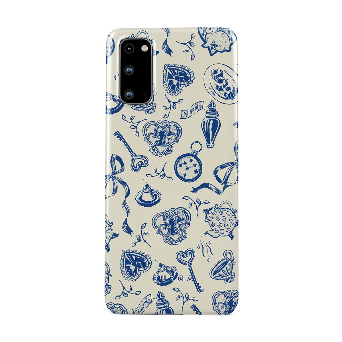 此設計特色: 茶杯、茶壺、懷錶、鑰匙、紅心、陶瓷、藍白圖案