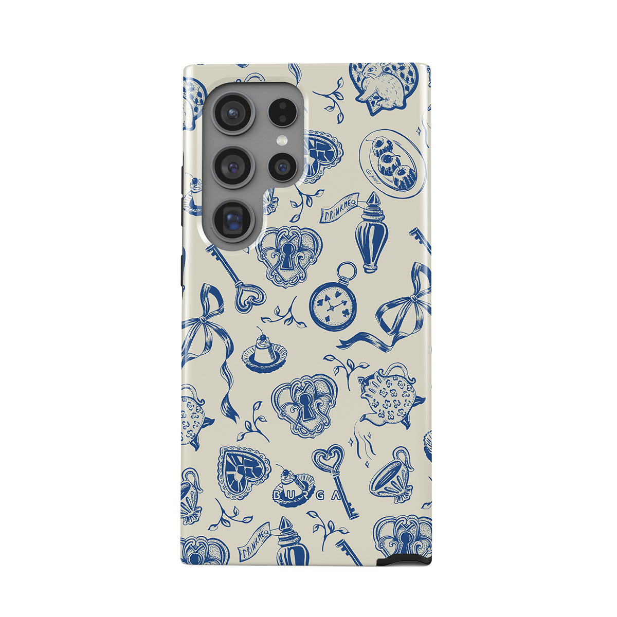此設計特色: 茶杯、茶壺、懷錶、鑰匙、紅心、陶瓷、藍白圖案