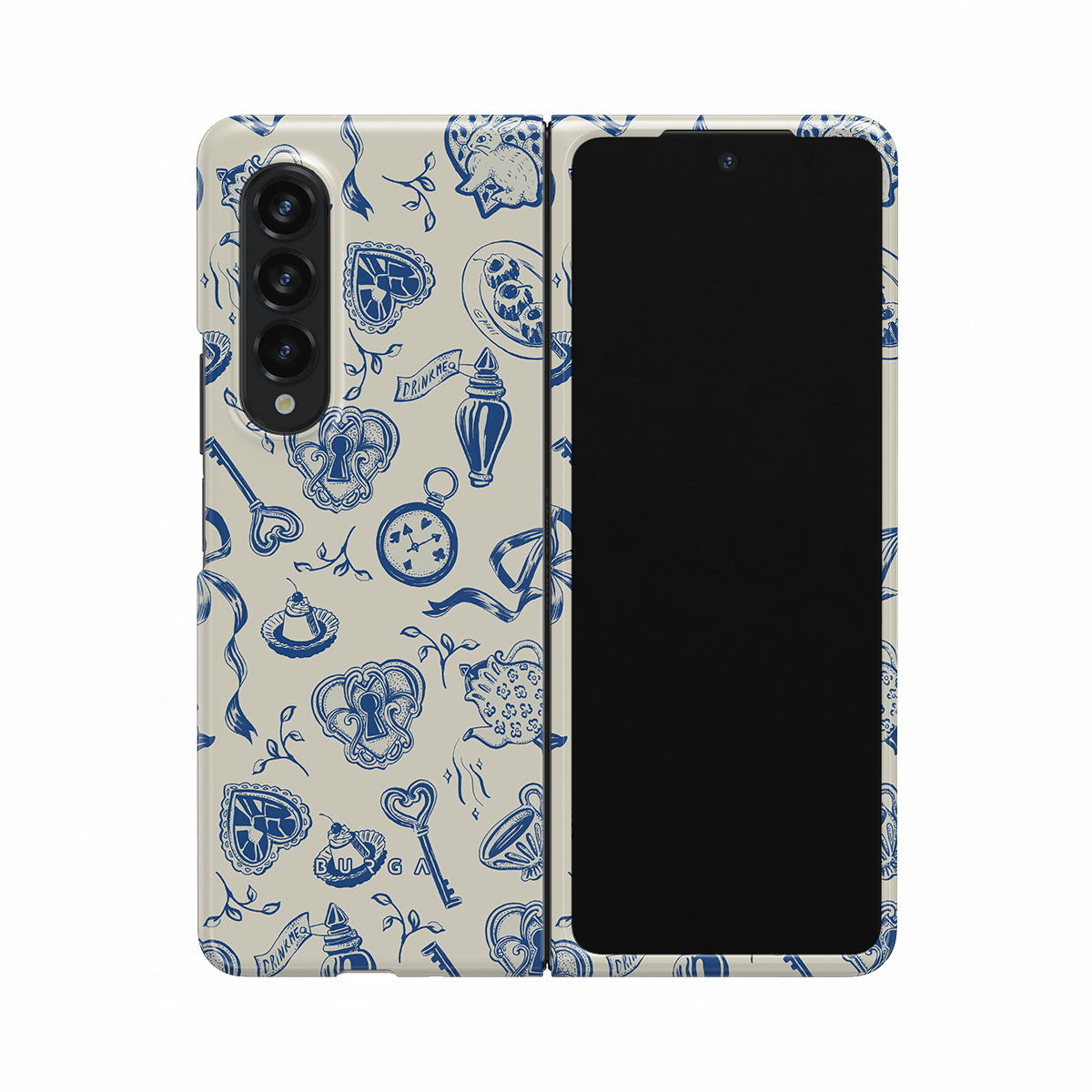 此設計特色: 茶杯、茶壺、懷錶、鑰匙、紅心、陶瓷、藍白圖案