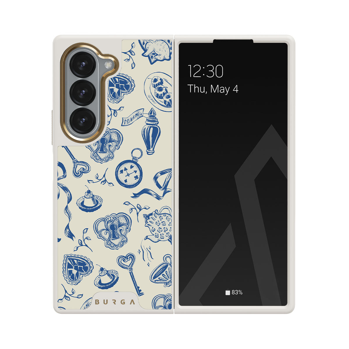 此設計特色: 茶杯、茶壺、懷錶、鑰匙、紅心、陶瓷、藍白圖案